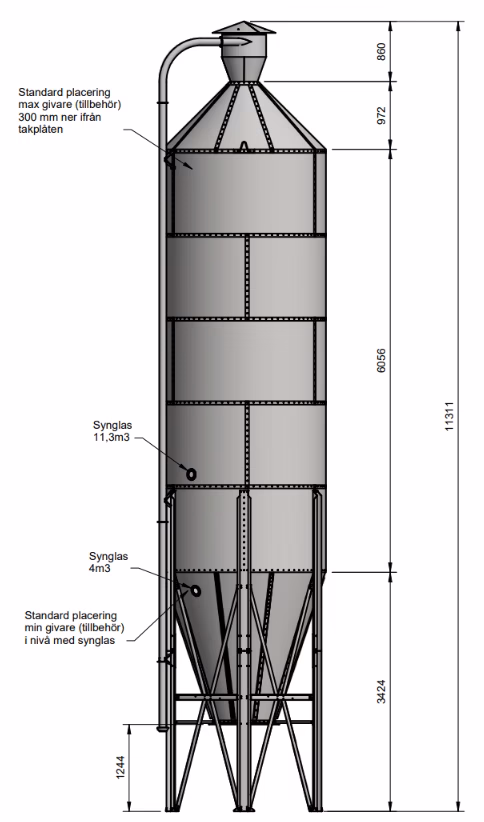 NOTE, the silo is delivered as standard with a filling pipe, cyclone with filling via long-radius bend, and a sight glass.