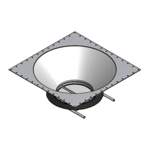 Transition from 300×300 mm to OK160 connection. The product is made of hot-dip galvanized steel sheet. Height: 165 mm.
