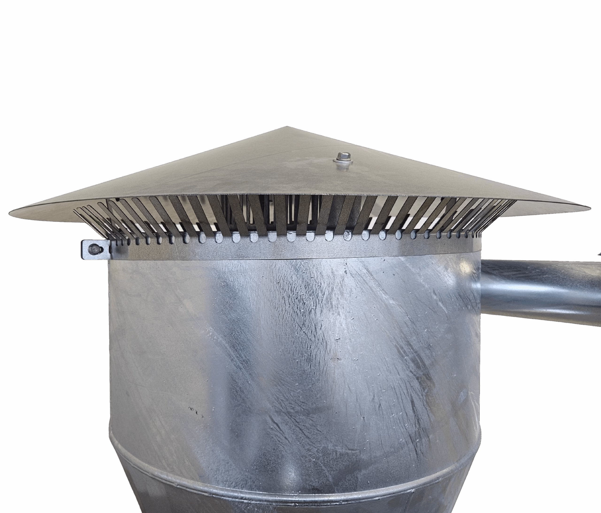 Weather and bird protection is an optional accessory that can be retrofitted to an existing cyclone. The “fingers” are bent at approximately a 35-degree angle, which prevents birds from flying under the cyclone’s roof. They also break up wind and snow, preventing it from accumulating under the roof.