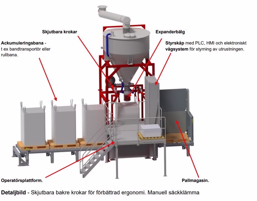 If the bag height allows, no operator platform is required, making the system compact and space-efficient. The enclosed filling system ensures a dust-free environment for the operator.